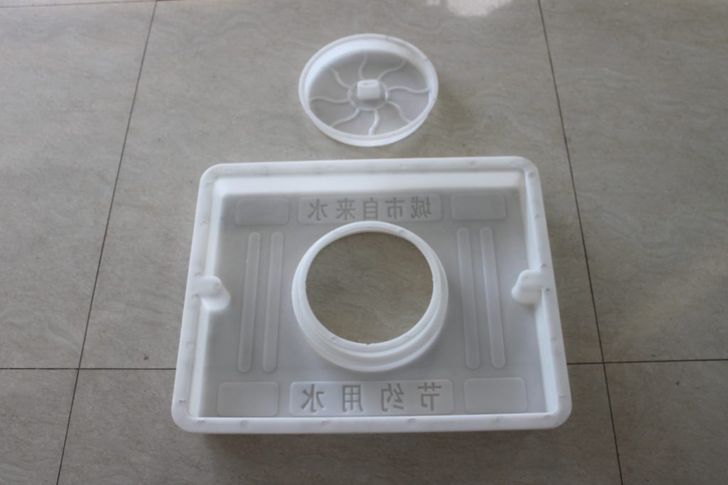此水泥方井蓋模具采用聚丙烯樹脂經注塑加工而成,模具兩端以小開口設計,以方便后期檢查時的位置移動。在方井蓋模具的表面加以防滑條及供水部門專屬字樣,即“節約用水”和“城市自來水”標志。而在方井蓋模具的中間設立一個小型的圓孔蓋座,為日后水廠對于自來水管的檢查工作帶來更大便利。