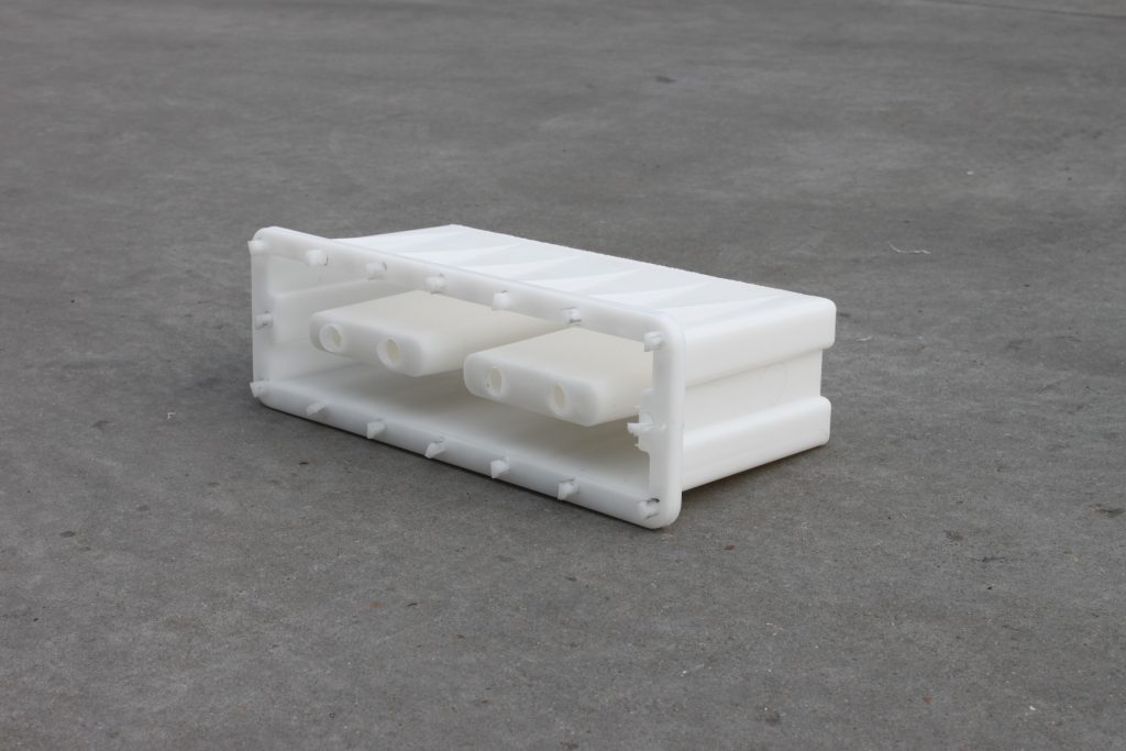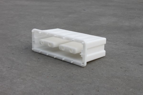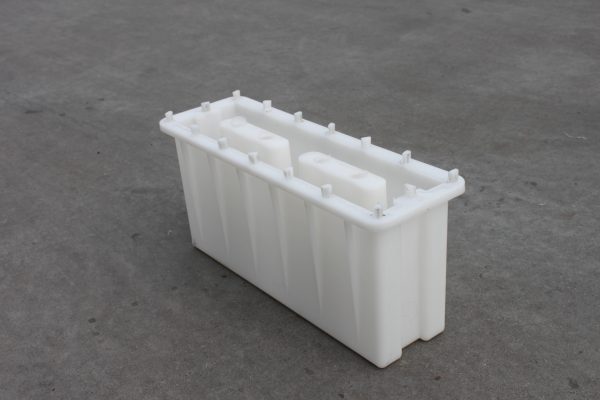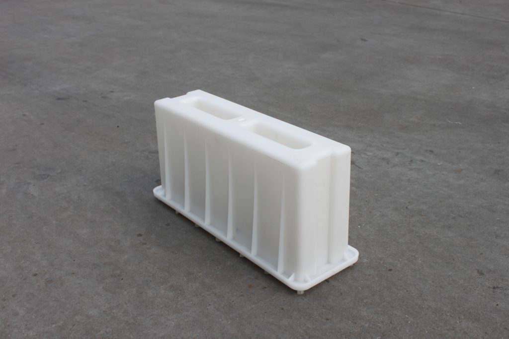 而這個(gè)塑料空心磚模具主要采用兩孔設(shè)計(jì),因?yàn)樗嗷炷撩芏容^重,在加上塑料材質(zhì)的模具基本都具備一定韌性,填充量過多易導(dǎo)致模具膨脹使得水泥空心磚成品變形,所在模具四周均采用加強(qiáng)筋設(shè)計(jì),對于防止這種情況的發(fā)生作用還是相當(dāng)穩(wěn)定的。