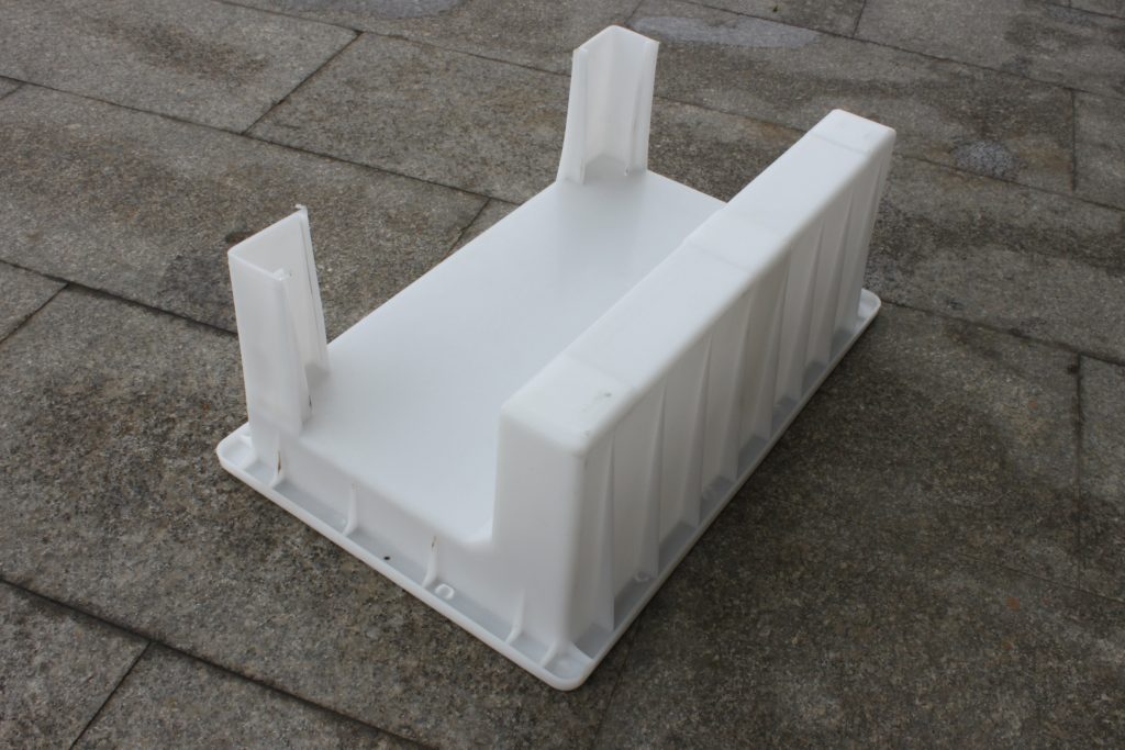 此款擋渣塊防撞型路牙石模具所用原料為聚丙烯樹脂,經注塑機高溫熔解后在鋼模具內成型完成。乍一看似乎樣子有點奇怪,其實所澆筑水泥防撞路牙石呈L型,模具底部的兩個腳為支撐柱,方便實際擋渣塊、擋土塊的澆筑過程。為保障防撞路牙石模具的使用耐久性,更是在受力兩面增加了十六條加強筋,有效提升重復使用次數,節儉生產成本。