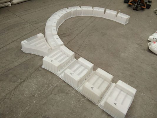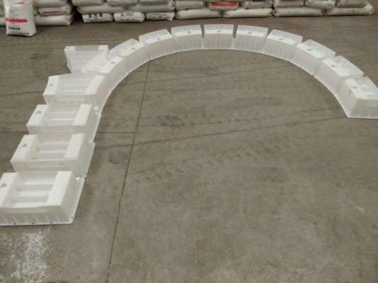其中部件A基座型拱形骨架護(hù)坡模具左右對(duì)稱,具體數(shù)量可以根據(jù)護(hù)坡實(shí)際高低需求來進(jìn)行水泥護(hù)坡磚的預(yù)制,一般高低為三個(gè)數(shù)量,左右共6個(gè)。部件B為拱形骨架護(hù)坡模具拱形部分,單拱鋪設(shè)共需10塊,部件C主要用于部件B和D接縫固定,可以更加有效的確保拱形骨架護(hù)坡的安全性,防止水泥護(hù)坡磚整體偏移及散架。