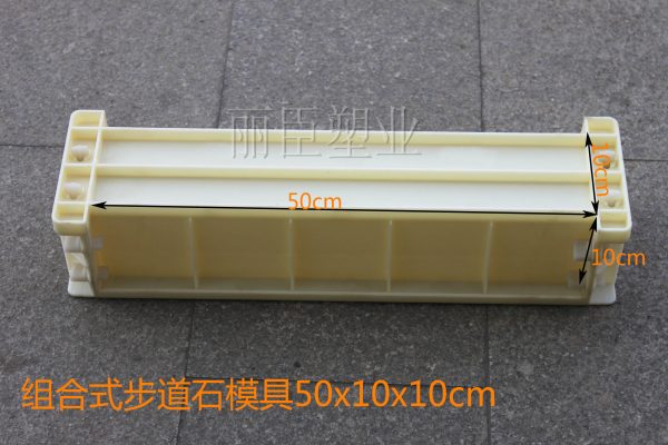 組合式步道石模具在用料上依舊采用ABS材質來作為主要生產原料,ABS材質澆筑成型的水泥步道石澆筑過程中不易發生變形,其運輸中就算是過度的綁扎也不會對步道石模具產生影響,因其可以進行拆分使用,50x10x10cm與25x10x10cm模具之間其使用的兩邊堵頭都是一致,所以在先前購買25長步道石模具的客戶在后買50長的步道石過程中可以減少購買堵頭的數量,依舊可以使用25長的步道石堵頭。