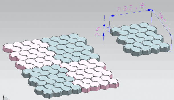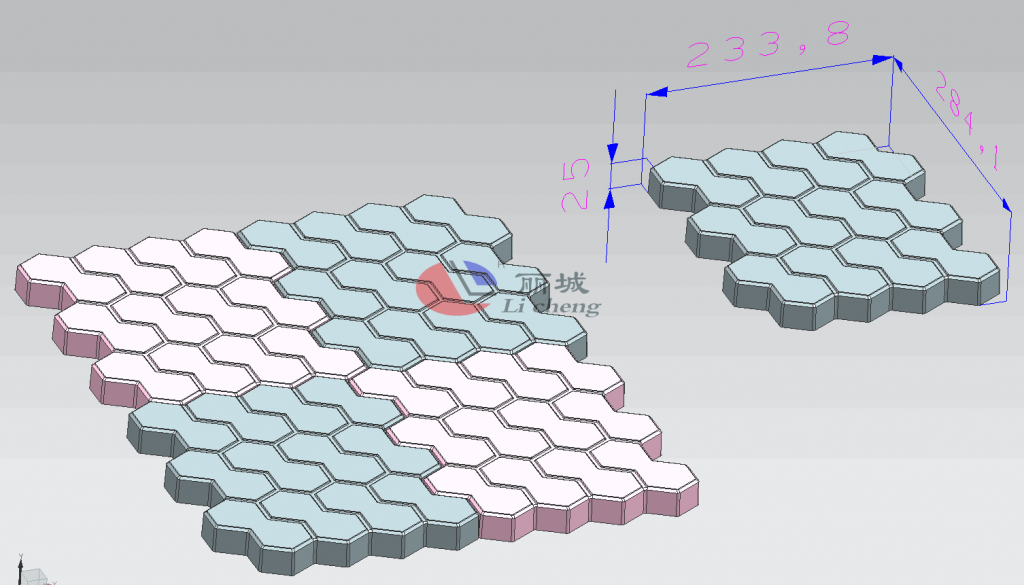 這款小八字彩磚塑料模具外觀上呈現(xiàn)出不規(guī)則形狀,遠(yuǎn)處看過去外觀有些像蜂巢的樣式,彩磚模具的規(guī)格為28.4×23.3×2.5,彩磚塑料模盒在制作過程中采用全新的ABS為主要生產(chǎn)原料,至成型后的彩磚塑料模具外觀整體呈現(xiàn)一種淡鵝黃色,其模具表面能有明顯的光澤感,下面這張圖是小八字彩磚模具澆筑成型后的模型款式。