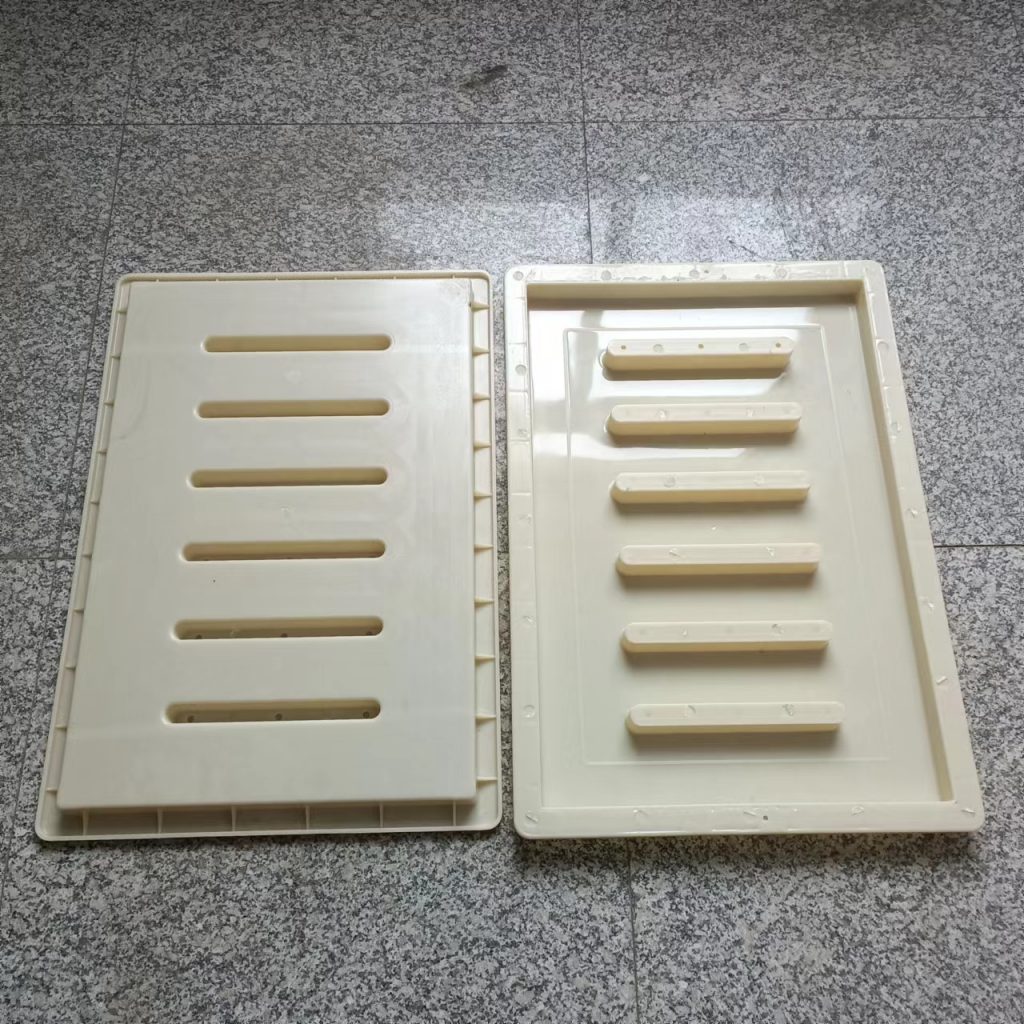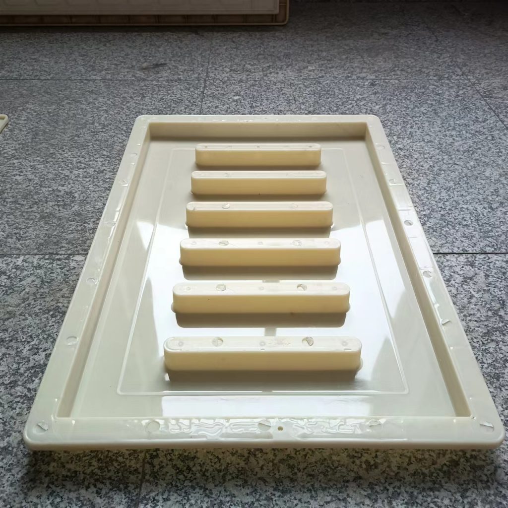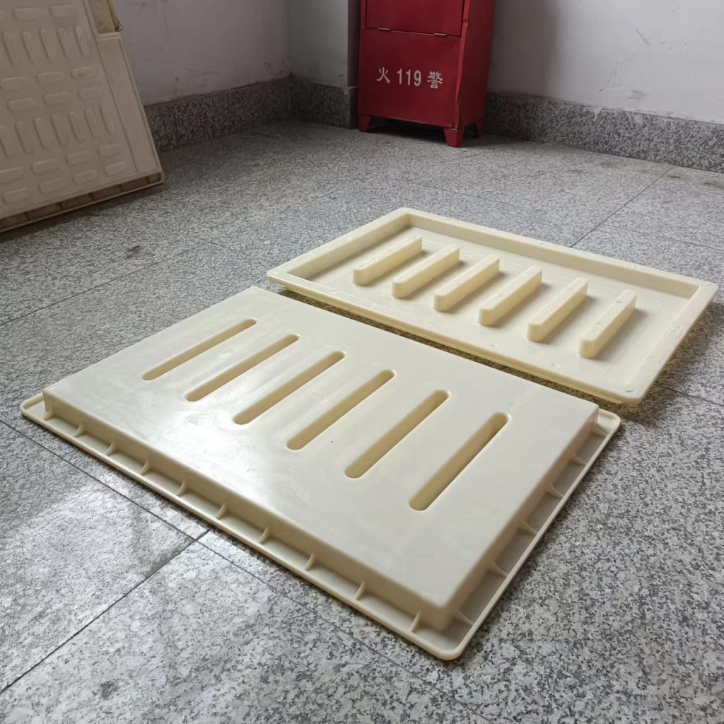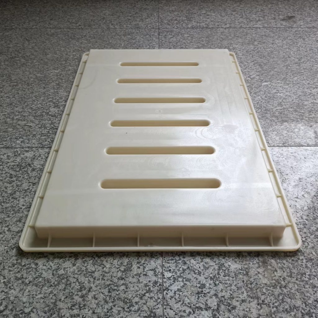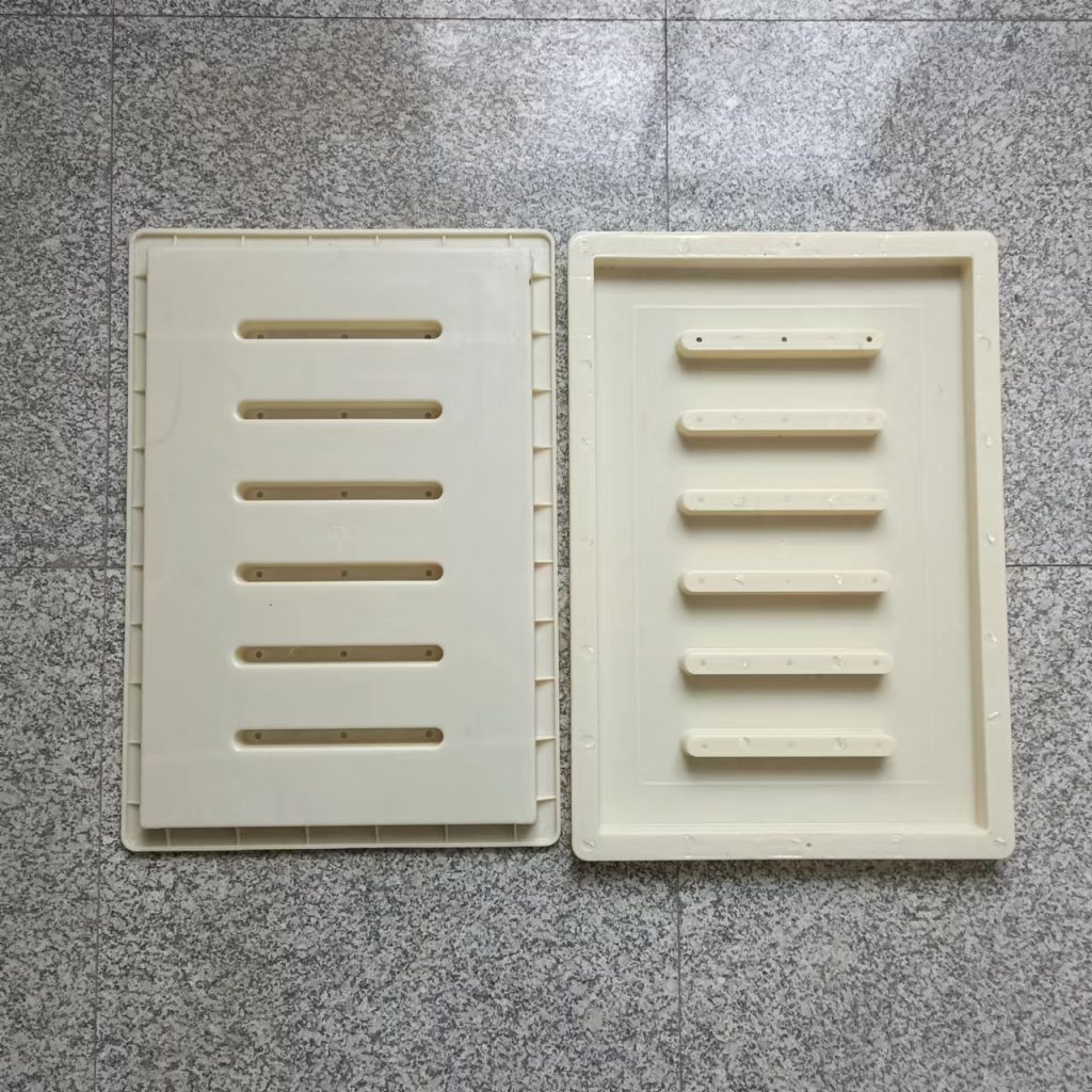 這款塑料雨水蓖模具厚度只有3cm,長(zhǎng)寬尺寸為60cm*40cm,他主要用于下水、流水蓋板活性混凝土預(yù)制(RPC)預(yù)制,他的厚度較薄,與一般材質(zhì)的雨水蓋模具不同,他采用的材質(zhì)是ABS材質(zhì),這種材質(zhì)質(zhì)地比PP材質(zhì)硬,強(qiáng)度大,使用次數(shù)多,這種模具主要預(yù)制成型雨水蓋板,普通用于市政道路路面排水使用。他一共有六個(gè)排水孔,排水效果很好。水流效果比較好