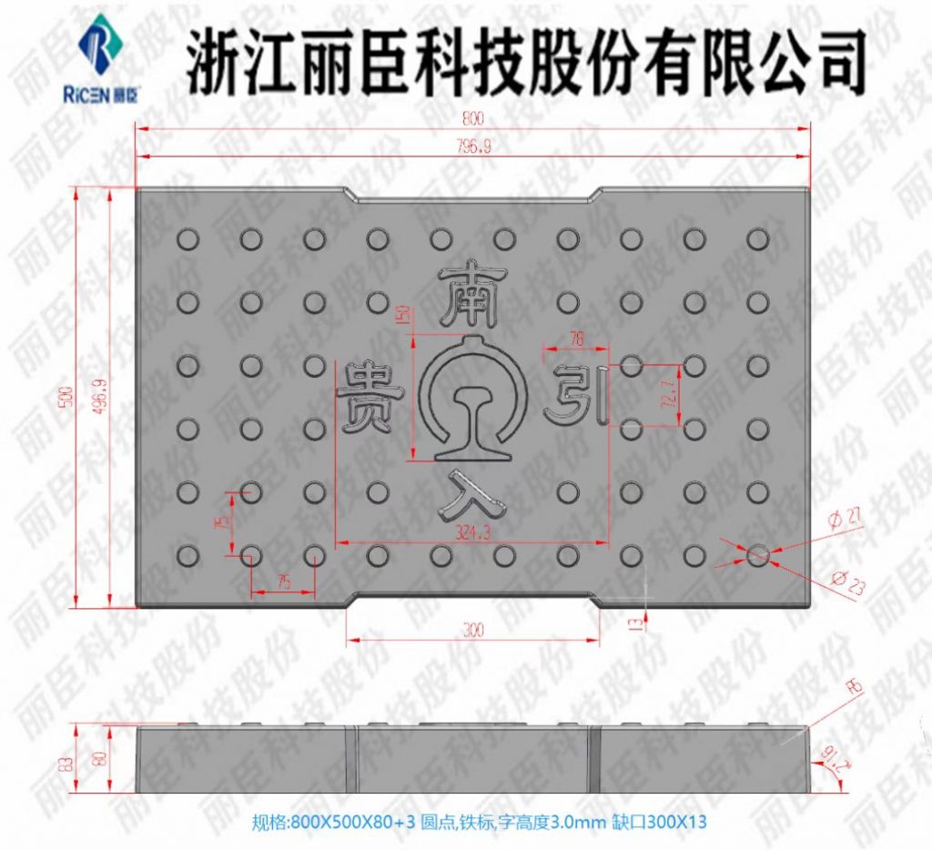 貴南引入系列蓋板,主要用于高鐵隧道蓋板定制系列、蓋板為缺口圓點(diǎn)帶鐵標(biāo)、板面帶字,為“貴南引入”。這款系列有三款尺寸蓋板尺寸分別為40cm*30cm、40cm*40cm、80cm*50cm、厚度相同為8cm厚,且三款模具的缺口也不同從小到大的尺寸缺口為10cm、20cm、30cm缺口,這款蓋板為2022年新生產(chǎn)的蓋板。